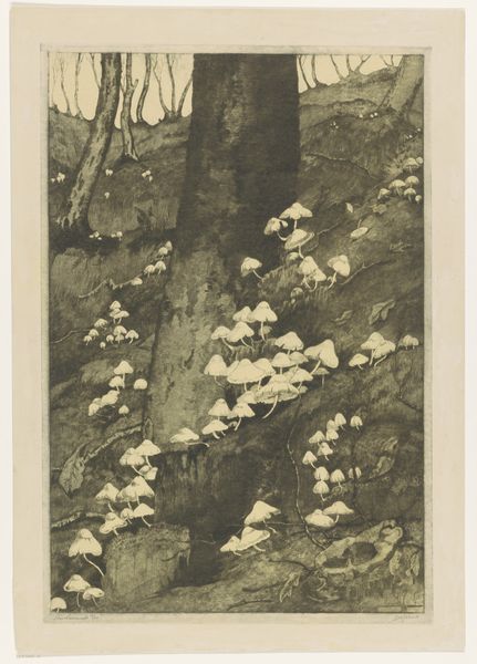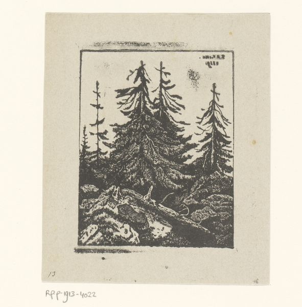 Curator: This is Simon Moulijn's "Fir Tree in Snowy Landscape," created around 1900. It's an etching, currently held at the Rijksmuseum. Editor: Ooh, it feels... cold. I immediately think of trudging through knee-deep snow. The stark black and white only adds to the chill. Curator: The etching process is key to achieving that effect. Think about the labour involved. The artist uses a needle to draw into a wax-covered metal plate, which is then bathed in acid to create the lines. Multiple stages of acid biting would be required to create these varying tones, making it both labour intensive and materially significant. Editor: It's incredible the detail he got with just lines. Look at the way the snow clings to the branches, so heavy it almost looks like it's weeping. It's both beautiful and slightly melancholic, like nature is hunkering down for a long sleep. There's this tiny cabin lurking in the background there too. You can imagine a single flickering light. It brings such an element of safety in such stark cold. Curator: I agree, the interplay between shelter and the vast wilderness speaks volumes about human interaction with the environment during that period. Etchings, being prints, are also about dissemination. Consider who might have purchased this; perhaps someone with a desire to experience nature and reflect upon rural labour. Editor: That makes so much sense; it has that feeling of something small yet profoundly human in the face of something enormous, timeless. Makes me wanna find some woolen socks and curl up with some hot cocoa. Curator: And the beauty lies, I think, in understanding that sentiment through the lens of its material production and distribution. This understanding lets us better appreciate not just what we are seeing but the processes behind how images shape our experience of the world. Editor: Right! And in some weird way, thinking about how it was made gives even more power to the little bit of human heart I read there. Thanks.