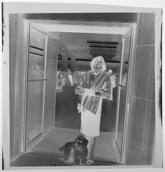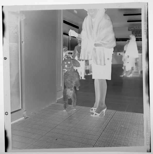 Curator: Immediately, I’m struck by the strange tonal inversions in this photographic negative; the high-contrast elements create an almost dreamlike quality. Editor: This photograph, currently titled “Untitled (woman from the neck down, dog on a leash)” by Jack Gould, presents an interesting snapshot, seemingly capturing a moment in public life. Curator: Indeed, the composition is rather fascinating. The cropped view emphasizes the material and the relationship between the woman and her dog. Her elegant attire speaks to a certain social class. Editor: And perhaps this photograph aims to subvert that very class through its unusual cropping. Note that the woman’s head is excluded, focusing on her body and accoutrements. The gaze is directed at the dog. Curator: The negative image also emphasizes the texture, right? The dog's fur, the woman's clothing… Editor: Absolutely. The high society’s aesthetic and the dog’s role becomes a curious commentary on societal roles. I will be thinking about that. Curator: An apt point. It does highlight the complexities inherent to photographic representation and visual language.