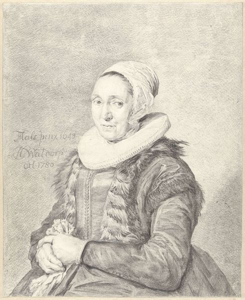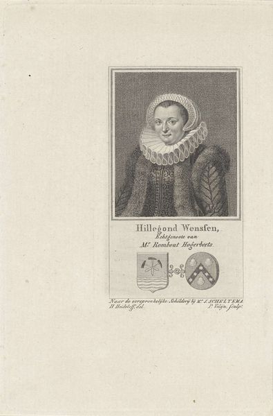 Curator: This is a print called "A Woman," by Pieter Tanjé, held in the collections of the Harvard Art Museums. Editor: It has a striking formality, doesn't it? The stark contrast of the dark clothing and bright ruff is almost sculptural. Curator: Indeed, the formal elements are quite deliberate. The composition, framing the sitter in a contained space, speaks to the constraints of portraiture in that era, reflecting ideals of status. The text surrounding the image suggests this is a copy of work by Peter Paul Rubens. Editor: I'm intrigued by the subject’s gaze. The direct address implicates the viewer, while her plain dress and severe facial expression suggest her social position. Curator: We might interpret the subject’s somber gaze as a commentary on the role of women in the period. It suggests themes of duty and self-sacrifice. Editor: It is a study in contrasts, capturing both the rigid conventions and the subtle humanity of its sitter.