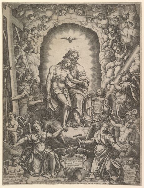 Editor: So, this is "St. Matthew," an engraving from 1518, after Agostino Veneziano, who was, in turn, inspired by Giulio Romano. It’s interesting how this image is already a copy of a copy! It has this otherworldly quality – St. Matthew looks like a Greek god. What significance do you think this layering of visual references adds? Curator: Indeed! The layering is crucial. Notice how St. Matthew’s portrayal blends classical figuration with Christian iconography. He embodies divine authority through physical presence – reminiscent of Zeus – yet his act of writing, guided by the angel, anchors him to Christian scripture. What enduring ideas about the transmission of divine knowledge do you think this visual blending aimed to convey? Editor: I see what you mean. It's almost saying that divine inspiration comes in many forms. The figure seems to inhabit both pagan and Christian worlds simultaneously. What about the angel and scroll? They feel very specific. Curator: Precisely. The angel functions as both divine messenger and practical assistant, emphasizing that inspiration is not a solitary act. And observe how the scroll, inscribed with text, grounds the ethereal scene. It suggests tangible, lasting consequences arise from the saint's divinely-inspired writing. This coupling reveals cultural memory at play – linking classical aesthetics with evolving Christian interpretations. Do you find echoes of this synthesis elsewhere in Renaissance art? Editor: Definitely. It’s almost like they were trying to legitimize the present by connecting it to a grand, idealized past. Curator: An astute observation! This print reveals how artists consciously shaped cultural identity, bridging past and present through enduring visual symbols. This reframing shaped both religious devotion and perceptions of artistic authority, and I’ll certainly remember that.