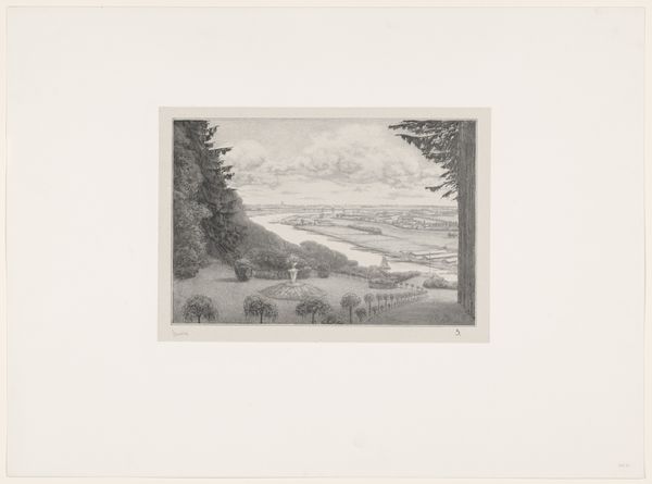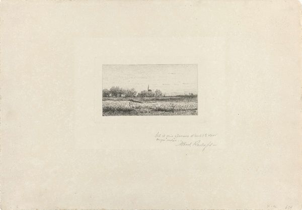 Curator: Looking at "Gyrstinge Sø" by Louise Ravn-Hansen from 1882, an etching currently held at the SMK, what are your immediate thoughts? Editor: Ah, it feels like a stolen glance, doesn't it? So fleeting and still at the same time. The water seems to hold its breath and the trees... They're like whispers in the distance. Melancholy maybe, or just peaceful. What do you see in it? Curator: What I see is how it subtly reflects broader currents. This landscape, seemingly simple, exists within a very specific artistic and socio-political milieu. We see in Impressionism a movement questioning academic tradition, turning to nature and everyday life. Further, what does it mean to depict the Danish landscape at this particular historical juncture? Editor: I suppose, when you look at it that way... It’s interesting you frame it like that, against "tradition," because that stillness I feel in it, it kind of resists tradition, doesn't it? There's no grand statement here. I almost want to jump into it; run around it and make a splash! How do the impressions relate to the time period itself? Curator: The landscape here, Gyrstinge Lake, isn't just a backdrop but a reflection of cultural identity and national romanticism prevalent in 19th-century Denmark. There were shifts in land ownership. So, whose gaze are we adopting when looking at this seemingly untouched landscape? Also, what does it mean for a woman artist, Louise Ravn-Hansen, to participate in this traditionally male domain of landscape painting and printmaking? Editor: Yes! The gaze! That's what's so subtle, I think. It's so cool when things aren’t so obviously "there," if that makes any sense. Makes me wonder if that stealing away sensation has some of that "untouched landscape" romanticism that’s kind of tongue in cheek by today's standards? Curator: Precisely. The beauty lies not only in the aesthetics but also in unraveling its complexities. This piece acts as a touchpoint to think about the ways we've inherited seeing and depicting land, ownership, and gender. Editor: And it looks so unassuming. You’d have no idea! Well, I for one am adding that to the list. "Don’t judge an etching by its landscape."