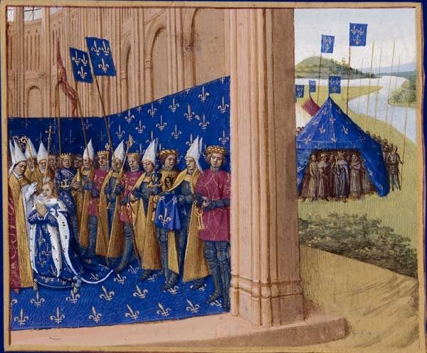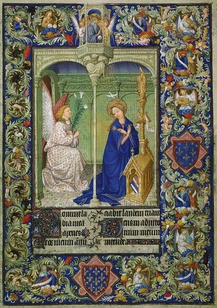 Jean Fouquet painted this miniature, "Marriage of Charles IV and Marie of Luxembourg," likely in the mid-15th century. Note the fleur-de-lis, symbols of French royalty, repeated across the blue backdrop and floor. This symbol, derived from the lily, has ancient roots, representing purity and association with divinity. The fleur-de-lis is not unique to France; we see it echoed in various cultures, from ancient Mesopotamia to medieval heraldry. This potent symbol can evoke feelings of national pride, religious purity, and even notions of divine right, engaging viewers on a deep, subconscious level. Fouquet strategically employs this symbol to underscore the power and legitimacy of the French monarchy. The fleur-de-lis has a history of non-linear progression, with the symbol surfacing, evolving, and taking on new meanings throughout different historical contexts.