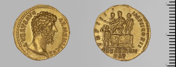 Editor: This is a gold Dinara of Huvishka, by Huvishka I. It's quite small. What symbolic meanings do you see embedded in its imagery? Curator: The regal portrait holds immense weight. A ruler portrayed on currency is not just identification, but a deliberate statement of power and legitimacy, echoing through generations. Editor: So, the image becomes a lasting message. Curator: Precisely. Consider the emblems they hold. These aren't mere decorations; they're potent symbols carrying layers of cultural memory and aspiration. What stories do you imagine they tell? Editor: I never thought of it that way. It’s like a language in images. Curator: Yes, and understanding that language unlocks a deeper appreciation for the cultural context in which it was created.
