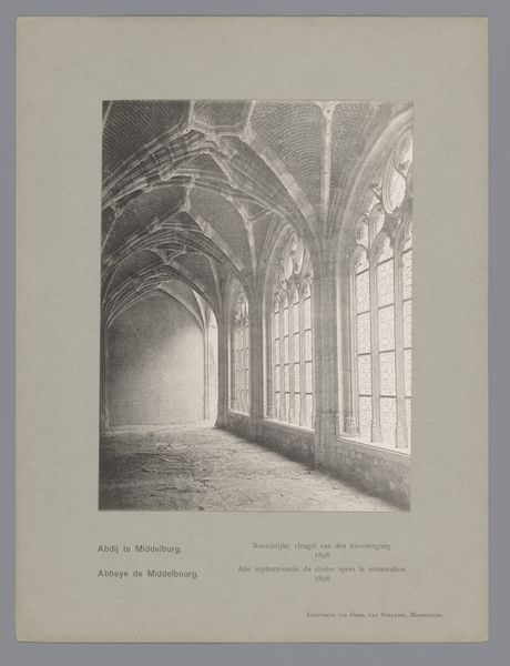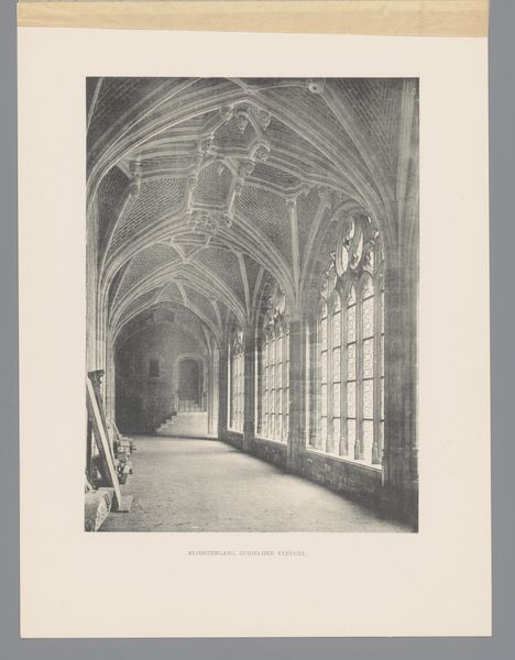 Curator: Look at this etching and photograph titled "Gezicht op de noordelijke kloostergang van de Abdij van Middelburg van binnen", or "View of the northern cloister of the Abbey of Middelburg from the inside" by C. Aubry Fils, created after 1906. It depicts an interior cloister, most likely within an abbey, showcasing pointed arches and large, mullioned windows. Editor: The high contrast immediately gives me a sense of starkness, almost asceticism. The long shadows suggest a space of contemplation, perhaps even isolation. What’s the broader story here? Curator: This piece resonates with a renewed interest in medieval aesthetics emerging in the late 19th and early 20th centuries. We need to examine the sociopolitical climate. How did secularization movements shift attitudes towards religious iconography and architecture? And how might the image of monastic life invite diverse interpretations for the contemporary observer, in relationship to themes of power, faith, or exclusion? Editor: Indeed, the architecture here—those pointed arches and ribbed vaults—are so heavy with symbolic weight. Think of the repeated arch, not only providing structural support but, for centuries, communicating ascent to the divine. What cultural baggage do we carry in interpreting these spaces today? Curator: Right! The building speaks of power structures: How much social and political weight did abbeys yield at the time? To engage deeply with the print, it’s imperative we critically reflect on what kind of visual stories were being sold—to whom—in an era steeped in change. Editor: So the composition almost performs a kind of longing? Light streams through the windows, creating this dramatic, almost yearning effect. It asks a lot of viewers and I would assume more people connected with faith related symbols than would today. What does it communicate to different demographics? Curator: That is definitely the question we need to ask. As always. Editor: This etching reminds us how symbolic systems evolve, accrue layers of meaning, sometimes retain emotional impact. Always worthwhile.
