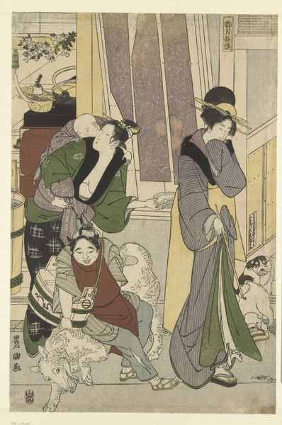 Curator: Welcome to our discussion of Katsukawa Shuncho's print, "Wachtende Liefde," created between 1790 and 1795. Editor: This print of three women has such an intimate feel. It’s very muted, even melancholic. There is such careful use of line and shape. How would you interpret this work? Curator: Let us first observe the structural organization. The composition, with its clear division between the foreground and the reflected background, directs the gaze across the horizontal plane. Notice the patterns: the contrasting textiles of the kimonos creating dynamism. Are the contrasting lines balanced or unbalanced in the print, and how might this relate to your comment on the melancholy? Editor: I see what you mean. The background feels softer, more static, while the foreground figures have a sharper contrast. It does create a sense of imbalance, which, for me, supports that idea of melancholy, even expectation. I guess that connects with the title. Curator: Indeed. It reflects a subtle dynamic inherent in the work itself, through shape and form. What of the two figures facing one another? What relationship do their gestural positioning imply? How might these subtle cues—angles and proximity—shape our engagement? Editor: Their faces are tilted towards one another in such a lovely shape, and I love that their hands nearly touch. The figure behind almost mirrors their tilt but in the opposite direction. I see more in it now that is communicated just by how their bodies relate. Curator: Exactly. Reflect upon how these observations on visual structure have deepened your engagement. Do you notice new details or perspectives on an emotional, visual, and perhaps material level? Editor: Definitely. Looking at the structural relationship between these figures revealed so much more to me. Thank you.