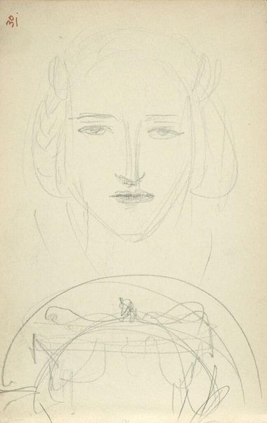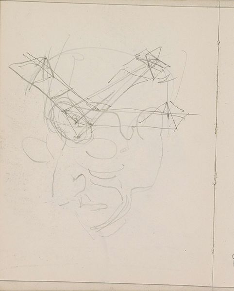 Curator: This is Denman Waldo Ross's "Sketch of a Male Head" held at the Harvard Art Museums. The delicate pencil work and geometric underpinnings give it such a curious feel. Editor: Indeed. My first impression is one of vulnerability. The exposed lines feel like an unveiling, almost an invasion of privacy. Curator: The lines almost cage the subject. Ross, known for his theories on design, probably used these structural diagrams to inform his composition. The starburst of angles, for example, could indicate a study of perspective and how it changes our interpretation. Editor: Yet, the geometric forms overlaying the face also echo societal structures that can constrain or even oppress. Ross's choice of a young male suggests to me a consideration of imposed expectations. Curator: Absolutely, and I think we also see an exploration of identity formation here, the way societal constructs impact one's self-perception. Editor: The gaze itself feels almost defiant, as if acknowledging those structures but refusing to be fully defined by them. It seems the artist is playing with symbols of liberation and imprisonment. Curator: It shows that even a simple sketch can reveal a complex interplay of artistic technique and social consciousness. Editor: A quick glimpse into the power of portraiture, and the multiple meanings we all create when looking at art.