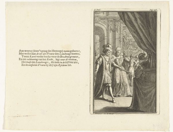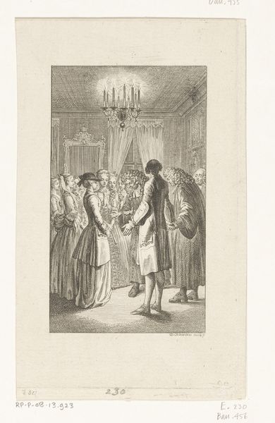Editor: We are looking at Georg Christian Schule's "Illustration med fem militærpersoner og en dame" from 1795. It's an engraving, currently residing at the SMK in Copenhagen. The scene strikes me as quite tense; there's definitely a narrative unfolding, with these military figures and a woman seemingly at the heart of it. What's your take on this piece? What story might Schule be trying to tell? Curator: Ah, yes. Doesn’t it just pulse with unspoken drama? Look closely. Notice how the artist has chosen to depict this moment? Everyone’s posture is stiff, guarded. The light, what little there is, seems to cling to the woman's face, highlighting her distress, or perhaps resolution. One almost wonders if she's a damsel in distress or, perhaps, the instigator of the whole affair. I do wonder, what do you feel is her disposition here? Editor: I feel like she might be putting on a brave face in a very vulnerable situation, almost caught in the middle. Maybe I'm overthinking, but she's not exactly swooning, right? What about the overall historical context of something like this? Curator: Spot on! Consider the time, the late 18th century - revolution brewing! Such moments in time always birth fascinating contrasts, don't they? The rigid structure of the old order – those very starched collars and severe uniforms – against the simmering potential for chaos and change. And the woman… she's a key. Perhaps representing the shifting sands of societal roles, eh? This is more than a mere snapshot, isn't it? Editor: Definitely a story worth digging deeper into. Thank you, I really appreciate how you pointed out the social context because that helps give meaning to this, so, cheers. Curator: Likewise! It seems that this is less an illustration and more of an opening for the start of an elaborate and interesting play of sorts!