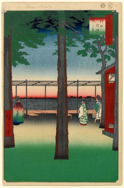Editor: Right now we’re looking at “Fuji Seen from the Left on the Tōkaidō,” a woodblock print by Utagawa Hiroshige, dating back to possibly 1858. It's lovely how he's framed Mount Fuji with those trees. What do you see when you look at this, especially considering the period it was made? Curator: Well, it's vital to recognize that ukiyo-e prints like these weren't simply artistic expressions. They were commodities, deeply intertwined with the burgeoning tourism industry in Edo-period Japan. How does that knowledge shift your understanding of the print? Editor: It makes me think more about who this was made *for*. Not just wealthy art collectors, but maybe travelers or people interested in travel? Curator: Exactly. The Tōkaidō was the main road connecting Edo, modern Tokyo, with Kyoto. Hiroshige’s series depicting this route helped shape perceptions and even promoted travel along it. Consider the carefully composed scene: the travelers, the meticulously rendered landscape, and, of course, Mount Fuji, a powerful national symbol. Editor: So, it's almost like an early form of advertising? A beautiful advertisement, but still serving that purpose. Curator: Precisely! Think about how it was circulated – as a print, readily available, influencing public perception of the Japanese landscape and national identity. These images participated in creating a shared cultural experience, connecting people to a place, even if they never physically travelled there. The 'floating world' wasn't just about pleasure; it was a landscape being constructed and consumed by a public. What does that make you consider further? Editor: It encourages me to think about the way that a common public has interacted with this and how widely available something like this was during the Edo period. I never considered it to be this readily consumable, popular media. Thanks! Curator: Absolutely! Considering the social context really illuminates how art actively participates in culture, shaping identity and even fueling economies.
