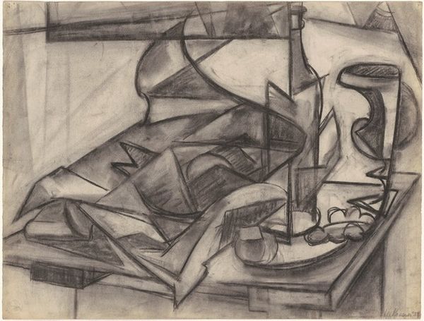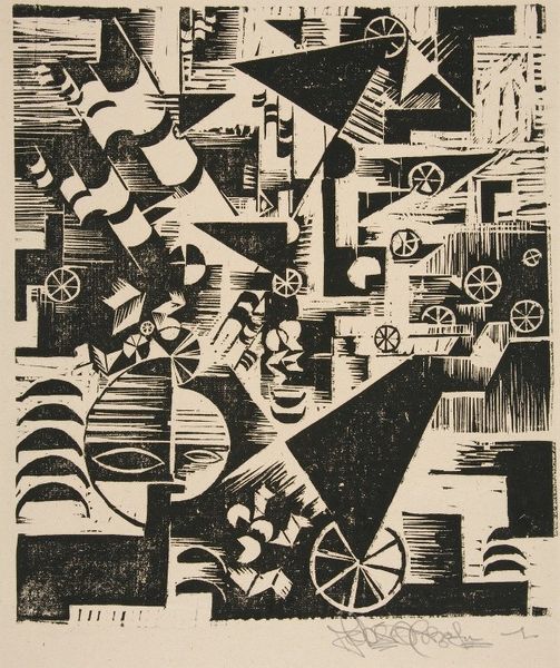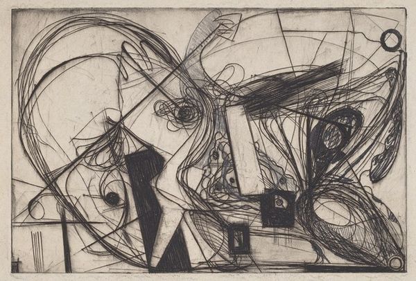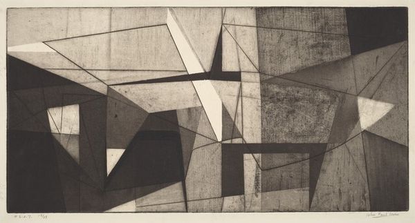 Curator: Standing here, looking at this image, the first word that leaps to mind is "labyrinthine". There's something so intricate, almost dizzying, about the way these geometric forms intersect. It’s like peering into the blueprint of a dream. Editor: And a quite haunting one at that. "Modification P.39", a print dating circa 1955 by John Hannah, certainly presents us with a striking composition. I'm interested in how Hannah's work is classified within Cubism—particularly in the graphic arts arena. It presents some interesting art historical challenges in categorization. Curator: Challenges are good! Because looking at it, the 'graphic art' tag feels spot-on. It's a language of pure line and angle, but somehow… tender? Is that strange to say about something so austere? The gradients and the way light seems to both reveal and conceal – there is so much implied texture that pulls you closer. Editor: It isn’t strange at all! Post-war, we see many artists grappling with reconciling pre-war abstraction with renewed socio-political awareness, exploring new relationships between the objective and subjective in art. Here we find a dance between mechanical and emotional space that defies cold analysis. Do you think the title is intentionally obscure? Curator: Probably. I suspect there is more to Hannah's choice. This piece might also speak to those times in which art can both mask or reveal itself and to others as art seeks constant re-modification. You know, sometimes the modification IS the art itself, it's not so much the process as it is about those small alterations on oneself that make an impression, at least on you, or perhaps even for someone else. Editor: That connects nicely to the historical setting. Mid-century modernism was, in some ways, about "modification"—the conscious altering of pre-existing styles, in response to new political and social realities. In the post-war period, Hannah created "Modification P.39" which in turn asks of its audiences to confront such artistic shifts. Curator: It makes you think doesn’t it? It has some quiet power that gets under the skin and makes me look twice at those assumed and taken for granted in my daily interactions. It may well be because such a striking combination of familiar yet disjointed pieces. Editor: I agree, and in this viewing of John Hannah's piece, our perspectives are enriched. We might see graphic art differently and, by implication, history too! Curator: Exactly. Thank you for sharing that! I think I like this a bit more now than I did a few minutes ago!