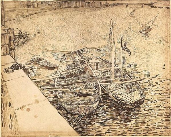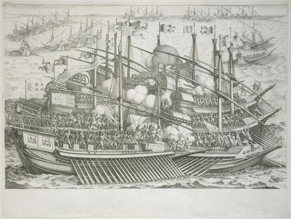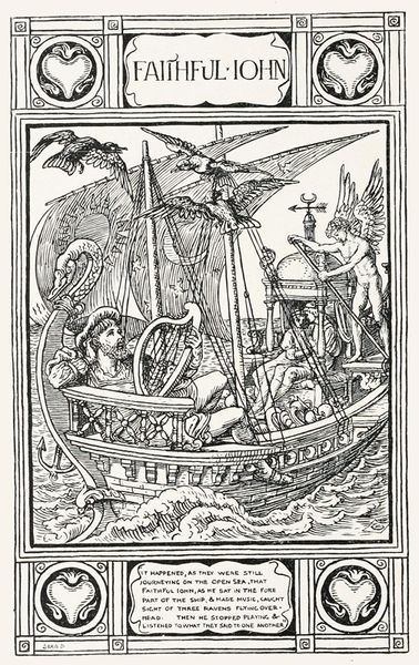 Walter Crane created this illustration with watercolor and ink, capturing a naval battle with striking visual clarity. Notice how Crane uses a high vantage point, which crams the composition with numerous ships and figures, all rendered in bright, almost decorative colors. Crane's formalism in detailing each ship with unique, symbolic shields disrupts any singular narrative. The shields, adorned with symbols like a swastika, bull, and serpent, function semiotically, offering fragmented cultural codes. These elements, combined with the repetitive patterns of the oars and the stylized waves, create a visual rhythm that belies the chaos of battle. The swan-headed prows of the ships add to the surreal atmosphere, further destabilizing a straightforward interpretation of heroism or tragedy. Crane invites us to consider the spectacle of war. The structured chaos and symbolic overload challenge fixed meanings, suggesting that war's representation is as much about aesthetics and cultural symbols as it is about historical events.