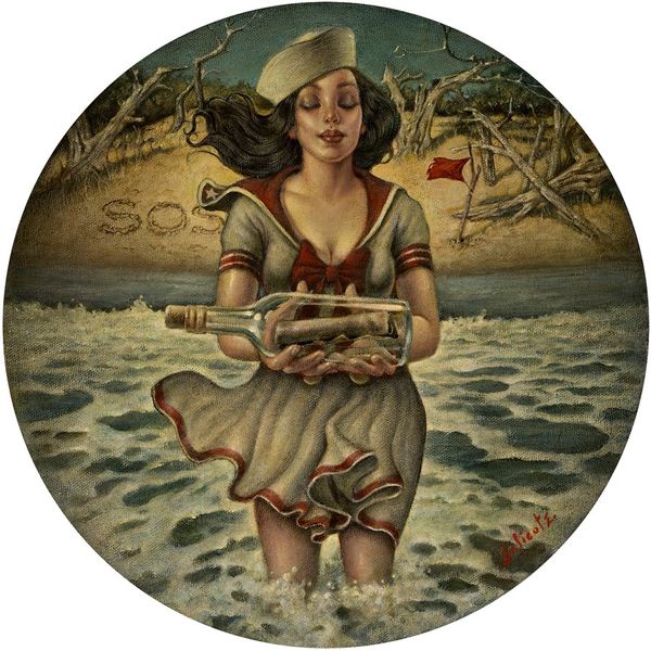Editor: So, here we have "Trick Shot Lucy," an oil painting by Danny Galieote. It’s a very stylized portrait of a woman dressed as a cowgirl, almost like a character from a retro movie poster. What strikes me is the almost exaggerated depiction of the figure - it’s realistic, but somehow… larger than life. What are your thoughts on this piece? Curator: "Larger than life" is spot on, I think! This artist, Galieote, is playing with a blend of realism and almost cartoonish exaggeration, creating a captivating kind of hyper-reality. Look at those Monument Valley buttes in the background... and those pouting lips! But it's more than just eye candy. I find myself asking, "What's *her* story?" You get a real sense of attitude, don’t you? What kind of mood do you feel when you look at Lucy's expression? Editor: Definitely, a touch of defiance or maybe playful mischief? It seems like the artist wanted to create a confident and charismatic woman. Do you think her gaze challenges our perception of femininity or a stereotypical view of the 'Wild West'? Curator: Precisely! I suspect Galieote's twisting classic symbolism - a pistol, the vast West, a confident woman - to challenge expectations. Maybe she isn't just an archetype. She is an invitation. Almost as though you would stumble on this painting in an old-timey saloon. I find this painting to be humorous with a dash of wit, how about you? Editor: I agree, it’s not a solemn piece! There's a sense of humour in the details like her gloves and neckerchief which are both punctuated with prominent star images. Seeing her brought the idea of female empowerment into a new light. Thanks for the conversation. Curator: My pleasure. This has really made me reconsider the old Western archetypes... Perhaps Lucy has her own spin on these symbols!