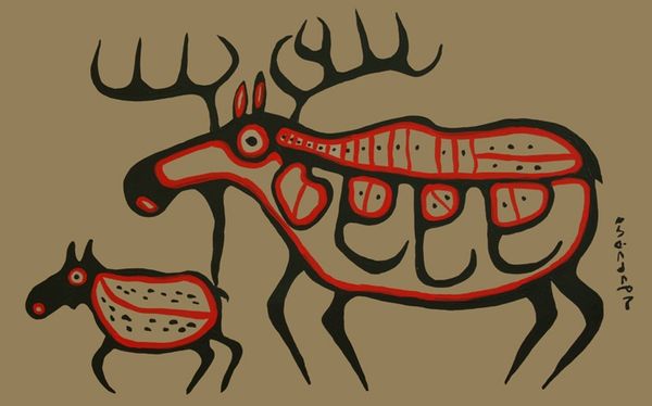 Norval Morrisseau made this ink drawing on paper, called Moose Giant, sometime during his lifetime. It's all about simple marks, a bunch of dots, straight lines and semi-circles. The way the artist breaks down the image into these basic shapes reminds me that everything, even a giant moose, can be understood through the simplest elements. The texture isn't something you can touch, but the density of the ink creates a visual buzz. The moose's body has this field of dots, like a constellation, which contrasts with the clean, bold outlines. Look closely at the legs and those pine trees; each one is slightly different, a testament to the hand-drawn mark, the imperfections make it so vibrant and alive. Morrisseau's work speaks to the visual language of storytelling, like pictographs or comic books. It's a bit like looking at a Cy Twombly, scratching away at meaning. There is a sense that art is just a conversation between people, a way to draw connections between one another.