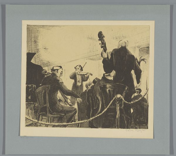 Editor: So, here we have Gaston La Touche's "Plate from l'Assommoir," created in 1878. It’s an etching, a print on paper. What strikes me is the air of weary resignation amongst some of the figures…the expressions seem quite heavy. How do you interpret this work? Curator: This piece really speaks to the socio-political realities of late 19th-century France. The title, "l'Assommoir," refers to Émile Zola’s novel, which explored the devastating effects of poverty and alcoholism on the working class. La Touche’s image captures this sense of despair, doesn't it? Consider the man holding up his glass—is he celebrating or desperately seeking solace? How might class inform our view of the image? Editor: That’s a darker interpretation than I initially considered! I focused on the surface—the lines, the composition. The potential class commentary does shift things. But do you think it risks being overly deterministic to assume every working-class depiction from this era carries such weight? Curator: It's a valid point. It's not about imposing a singular narrative, but examining the context. Think about who had the privilege to make and consume art at this time. This image, referencing Zola's work, likely aimed to provoke thought among a bourgeois audience, exposing them to a world they might not otherwise encounter. So how does that alter the artist's potential message? Editor: So the setting and implied narrative work to confront social inequalities, not just depict a scene. It's a powerful lens to consider. Thanks! Curator: Precisely. It’s in considering the socio-economic context of production, along with its visual elements, that this work reveals itself, showing the tensions of its time. Always remember art does not exist in a vacuum.