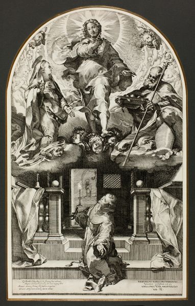 Curator: Before us is Federico Barocci's "Saint Francis in the Chapel," currently residing at the Harvard Art Museums. Editor: The crisp lines of the etching create an ethereal mood, a vision emerging right before our eyes. Curator: Indeed, and if we look closer, we see Saint Francis kneeling, bathed in divine light, witnessing a celestial gathering, including Christ, Mary, and other saints. Editor: The material reality of his worn habit contrasts with the swirling heavens. It speaks to the Franciscan vow of poverty but is still a very opulent print. Curator: Absolutely. The symbols—the skull, the crucifix—are visual reminders of mortality and redemption. The figures are arranged almost like a tapestry of faith. Editor: Considering Barocci's workshop practice, I wonder about the division of labor and the distribution of these prints. Were they intended for private devotion? Curator: They certainly served to carry potent visual theology, echoing through time, touching diverse hands and hearts. Editor: An interesting interplay of the earthly and divine, captured through reproducible means.