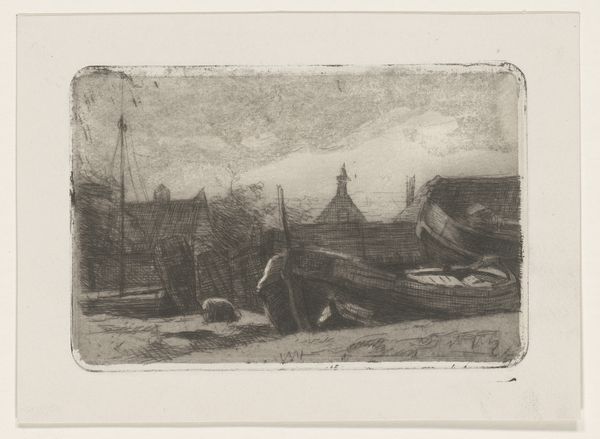 Johan Hendrik Weissenbruch made this landscape view with black chalk, a medium that is not quite as granular as charcoal, not quite as precise as graphite pencil. In this work, the inherent qualities of the chalk influence the appearance of the work, particularly its texture. Weissenbruch used the chalk to capture the damp atmosphere of the scene. The strokes of the chalk are visible, adding a sense of movement and energy to the drawing. There is also a starkness to the monochromatic palette, which only serves to heighten the feeling of desolation. The use of chalk also speaks to the artist's engagement with the tradition of drawing as a fundamental skill for painters. Chalk allowed for quick studies and preliminary sketches, capturing the essence of a scene before committing to a more elaborate painting. It is a humble medium, yet capable of great expressiveness in the right hands. Weissenbruch elevated chalk, bridging the gap between the sketch and the finished work of art.
