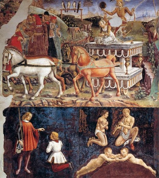 This detail of the “Triumph of Venus” is a fresco made by Francesco del Cossa, painted in the Palazzo Schifanoia in the 15th century. Here we witness a complex dance of gender roles and societal expectations. Renaissance society placed women within a rigid framework, often valuing them for their beauty, chastity, and ability to produce heirs. The women depicted here are adorned in finery, embodying ideals of beauty and virtue. But these women are not simply passive objects of admiration. Look closely, and you'll notice the subtle expressions, the knowing glances, and the gestures. Del Cossa both embraces and subverts traditional representations. On one hand, he adheres to the conventions of courtly love and feminine virtue. On the other, he infuses the scene with a sense of dynamism and agency. He seems to suggest that women are active participants in the game of love and desire. They navigate the complexities of courtly life, perhaps asserting their own desires.