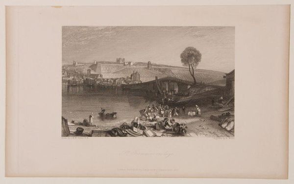 Curator: John Bromley's "Kirkstall Abbey on the River Aire" presents a landscape dominated by ruins, meticulously rendered with a focus on tonal variation and linear perspective. Editor: It's wonderfully melancholic, isn't it? The way the light catches the abbey ruins across the water, almost like a fading memory. Curator: Indeed. The composition draws the eye from the foreground’s detailed flora to the abbey, using the river as a reflective plane to create symmetry. Consider how the verticality of the architecture contrasts with the horizontal flow of the water. Editor: The trees on the right leaning in toward the river are particularly lovely. Like the whole scene's holding its breath. Curator: Observe also the cows drinking in the river. It's a pastoral scene, juxtaposing the grandeur of the abbey with the everyday life surrounding it. Editor: It leaves you wondering about the stories these stones could tell. Curator: Precisely. Bromley masterfully captures a sense of time and place. Editor: A quiet meditation on what endures.