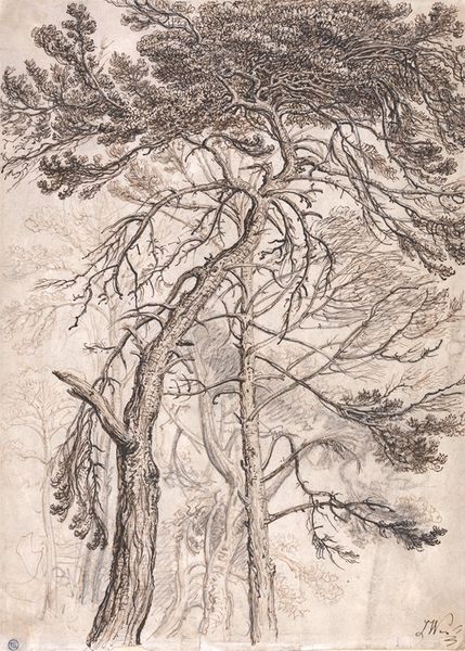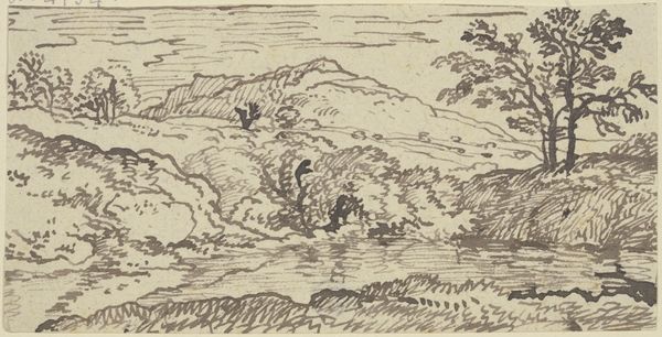 Curator: At first glance, this landscape conveys a sense of romantic desolation. Editor: Indeed. This is Joseph Farington's "Landscape, with Castle," held at the Tate. Farington, who lived from 1747 to 1821, captures a scene infused with the picturesque aesthetic, a popular movement in Britain at the time. Curator: The castle ruins resonate with themes of lost power and the transience of human endeavor, wouldn't you say? The sketch evokes a sense of melancholy tied to Britain's colonial past. Editor: Absolutely. Farington’s landscapes often served as visual commentary on the shifting socio-political landscape of England. This drawing reflects the era's fascination with ruins as symbols of fading empires. Curator: I see it also as a reflection on the relationship between humanity and nature, which is also a recurrent theme in art history. Editor: A poignant intersection, for sure. Thanks for sharing your perspective!