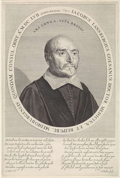 Editor: This is a portrait of Pierre Gassendi, an engraving by Cornelis Visscher from between 1638 and 1658. The subject's somber expression and the linear precision of the engraving give it a very dignified and intellectual feel. What do you make of this piece? Curator: The image radiates a powerful sense of intellectual presence, doesn't it? Gassendi was, of course, a prominent philosopher and scientist. Consider how Visscher uses line, especially around the eyes and mouth. What emotions do those details evoke in you? Editor: I see intelligence, definitely, but also maybe a hint of weariness, or… skepticism? Is it common to see that sort of conflicting message in portraits of intellectuals? Curator: It's interesting you see weariness. The slightly downturned mouth and those etched lines suggest experience and perhaps contemplation on complex matters. That perceived skepticism might mirror Gassendi's own questioning of established dogma. The symbols here—his clerical garb, the text below—all contribute to a narrative of scholarly life. The gaze, directed slightly off-center, engages the viewer but maintains a certain distance, protecting intellectual privacy. What else does it trigger in you? Editor: Thinking about it now, the way the image is framed almost presents him as a figure of study, a specimen. And yet, the slight imperfections in the lines, almost like sketch lines, bring a humane feel to it all. Curator: Precisely. It reminds us of the complex interplay between the individual and the roles they occupy. That balance of humanity and high intellectualism is key to decoding its sustained cultural significance. Editor: That makes the portrait so much more dynamic than I initially thought. Thanks for helping me see it.