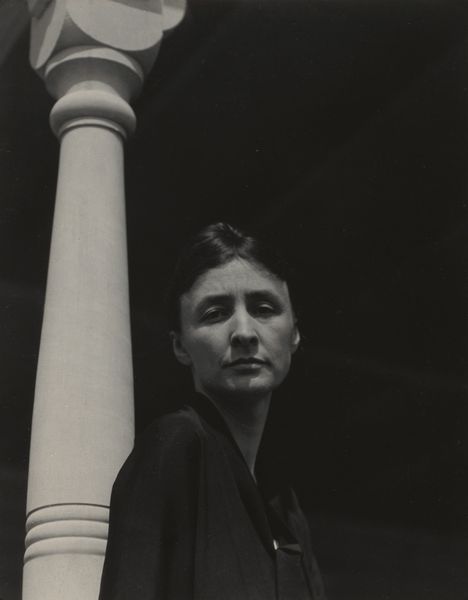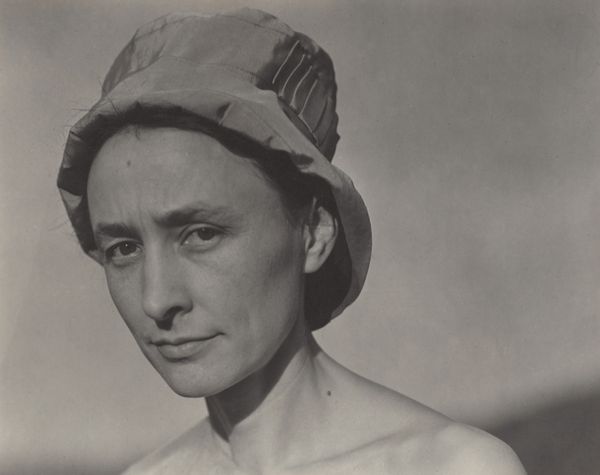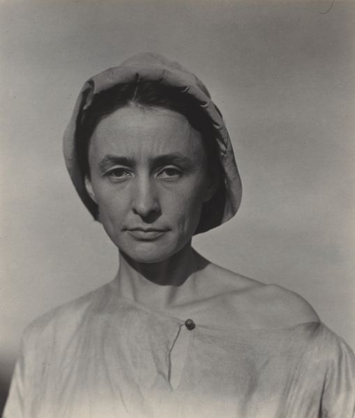 Editor: This is a photograph titled "Georgia O'Keeffe with Matisse Sculpture," taken by Alfred Stieglitz in 1921, using the gelatin-silver print process. I’m struck by the monochrome palette and the juxtaposition of O'Keeffe's gaze with the presence of the sculpture. How do you approach interpreting a photograph like this? Curator: My primary focus falls on the formal arrangements within the frame. Notice the composition. It is divided, subtly, into thirds. O’Keeffe’s face, itself a study in subtle gradations of light and shadow, occupies one. The sculpture, another. Then, consider the tonal range. Editor: The tonal range is quite limited. A study in beige and cream. Curator: Precisely. It leans heavily on the mid-tones. Ask yourself: what does the tight tonal range accomplish? Does it flatten the space, emphasizing the two-dimensional nature of the photograph? Is it possible Stieglitz pursued a Pictorialist strategy? How is the artist attempting to transcend the photograph’s documentarian reality? Editor: I hadn't considered how Pictorialism could play a role here. Focusing on those formal aspects shifts my understanding quite a bit. It's not just about *who* is in the photo, but how Stieglitz is constructing the image itself. The lighting, the limited palette... they all contribute to a carefully constructed artistic statement. Curator: Indeed. Consider the subtle grain of the gelatin-silver print and the careful arrangement of the subjects within the frame. These material and compositional elements shape our experience. The medium, its texture and tonal possibilities, contribute fundamentally to meaning. It moves beyond simple representation. Editor: So, by focusing on the structure and materiality, we can move towards decoding the visual language that Stieglitz is employing. It's less about external references and more about what's intrinsically present in the artwork. Curator: Precisely. It is in this close reading that art historical methodologies truly begin.