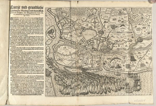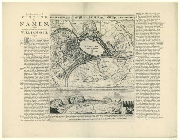 Curator: So, here we have “The Siege of Namen, 1695,” an anonymous engraving from 1695 currently held in the Rijksmuseum collection. Editor: It's striking how detailed it is! Almost like an aerial photograph of a city under siege, but it’s a print. How would you interpret the image's visual language? Curator: Well, as an iconographer, I see potent symbols woven throughout. Notice how the city of Namur and its imposing citadel become symbolic bodies, vulnerable yet resilient, under the pressure of military assault. The map is more than a factual representation; it’s a projection of power, struggle, and cultural memory. Do you see how the lines create a feeling of overwhelming force? Editor: I do. It's a lot of dark hatching, suggesting perhaps not just siege, but destruction. Curator: Indeed, and beyond immediate depiction, consider the image as a form of cultural transmission. What aspects of this piece act to elevate its cultural memory and what does it reflect about the continuity of Western culture, perhaps psychological as well? Editor: It memorializes the event. That much seems clear. Beyond that, though, I suppose it shows the relationship between geographical strategy and warfare at that moment in history. It feels very…technical. Curator: Precisely! Technique used toward symbolic ends! The rendering is so exact, implying human control of geography and of warfare. But there's drama, too: that sense of history being made, a new order being forced upon the old. Editor: That adds another layer! I initially thought it was just documentation. Curator: The engraving is rich in history, literally charting one moment while metaphorically hinting at so many continuities that are more abstract than its lines. I see the map as an enduring record of collective trauma and cultural transformation. It shows more than strategy; it's visual culture as it changes with each passing moment. Editor: Wow, I definitely appreciate that richer interpretation, going beyond just the visual representation and acknowledging symbolic meaning, and memory!