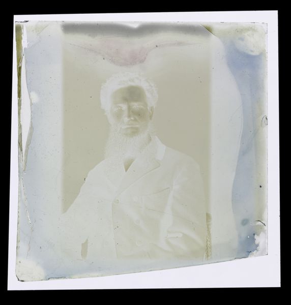 Curator: The image we are viewing, "Portret van een man, mogelijk een zelfportret," is a gelatin-silver print likely created between 1865 and 1900. Editor: It has a ghostly quality to it. The tones are inverted, and there's a soft focus that evokes a strong feeling of romanticism, it really leans into drama, I can immediately perceive his solemn mood. Curator: Absolutely. The Romantic era prized the individual, and portraits like these were charged with notions of authenticity, as they provided insight into the sitter's inner state. Editor: Tell me about it; you get a very melancholic impression just by observing how this figure, frozen in a brief moment in time, transmits such vulnerability. I'd point out how his dark attire provides high contrast. Also, it might sound odd, but the small artifact spots across the medium only add up to the emotional character of the artwork, becoming an element of disruption to the overall composition. Curator: Consider the power of self-representation through photography in this era. A "photographic consciousness" emerged as people started using photography to form and negotiate ideas about themselves, their families, and their communities. I agree about the Romantic feeling in the shot, it looks deliberately pictorial, the soft light gives the face such sculptural shape! It has all the cultural marks of an epoch: it carries symbols of cultural memory that keep being recreated in other works. Editor: The angle emphasizes this. He’s presented slightly in profile, not a direct engagement, that creates a degree of removal, contemplation, and inward reflection, the light emphasizes key aspects such as the face and his white shirt. Curator: This photograph is more than a historical document; it's a complex artifact where romantic and introspective cultural values come alive. Editor: Exactly. And its visual imperfections paradoxically reinforce its artistic statement. Its artistic imperfection adds beauty to this composition, just as life’s beauty stems from acknowledging and even celebrating its imperfection and incompleteness.