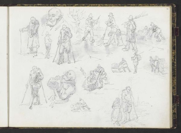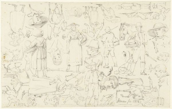 Editor: This is "Figures in Medieval Costume," a pencil drawing by Eugène Delacroix, made sometime in the 1820s. There's something so intriguing about sketchbooks...like catching the artist mid-thought. What strikes you about this page? Curator: It's a peek into Delacroix’s imagination, isn’t it? These figures, seemingly plucked from the Middle Ages, are less about historical accuracy and more about atmosphere, the raw emotions he'd later explode onto canvas. What does their clothing, or the way they carry themselves suggest to you? It's a dance of observation and imagination... almost like historical dress-up. Editor: That "dress-up" aspect is what makes it so lively. They're like actors preparing for a play. There’s one figure with what looks like a dog’s head! Was Delacroix thinking about folklore? Curator: Perhaps! Or Shakespeare! There are echoes of costumes from history plays, don't you think? Consider the Romantic obsession with the medieval period - it was a land of dramatic possibilities, untethered from the classical restraint. Delacroix latches onto that. What mood does that inspire? Editor: A little chaotic, but also… playful. It’s as though the artist is inviting me to join in the masquerade. The quick lines suggest the fleeting nature of imagination. Curator: Exactly! It is alive and bursting with inspiration. Like a dream one strains to remember and desperately tries to get on paper before it fades completely! Editor: It's amazing to see the seeds of his grander paintings in something so informal. This makes me appreciate the work that goes on behind the scenes!