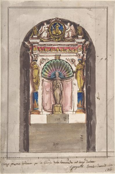 Curator: Here we have Warren W. Lemmon's "Painted Wall Decoration, Detail of Pilaster," dating to approximately 1936. It's rendered in watercolor and colored pencil. Editor: Immediately, I’m seeing echoes of ancient temples, right? But through this very curious, muted palette. Sort of classical grandeur filtered through a dust storm, maybe a post-apocalyptic nostalgia? Curator: Absolutely, that feeling resonates. Given the date, the social and political backdrop would heavily inform its interpretation. It evokes the 1930s while consciously recalling much older power structures. It seems an explicit attempt to evoke a nostalgic grandeur that carries undertones of anxiety, and failed futures. Editor: Exactly. This is definitely a vibe. And I feel it. The precision in the geometric details almost hints at an architectural rendering but there's an off-kilter feeling that undercuts this intention.. What strikes you most? Curator: For me, the most fascinating part is the material contrast. The delicate watercolor combined with the sharp precision of colored pencil create this visual tension, a paradox of stability and fragility mirroring a society grappling with its own instability, a failed economy, looming war, and societal fracturing, painted by someone surely feeling the precarity. Editor: Oh, for sure! Like it wants to be imposing and permanent, stone maybe. But then you realize it’s paper, it’s pigment…the dream of power, the memory of dominance is painted in impermanence, right? A fragile illusion? And those almost childlike decorative motifs, dangling like ornaments… I am almost inclined to imagine the pilaster of a very fabulous, melancholic puppet theater... Curator: A theater collapsing in on itself! Perhaps Lemmon understood that even seemingly invincible structures carry their own eventual obsolescence. This decorative flourish might signal toward performative rather than truly enduring values. Editor: Perhaps? Now I almost feel haunted in front of it… Thank you. Curator: Indeed. It invites us to reconsider those very structures. Thank you as well.
