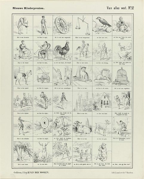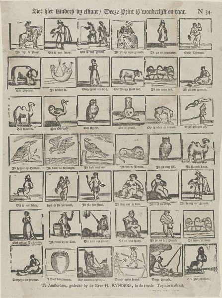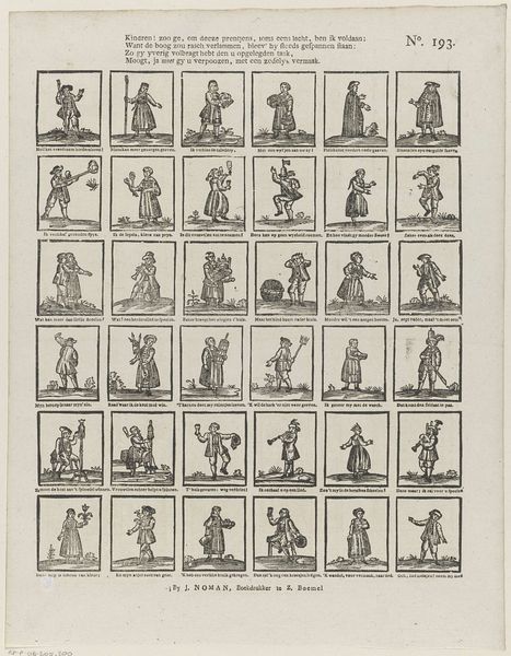 Curator: This engraving by Izaak Enschedé, created in 1730, is a fascinating example of early comic art. It depicts a series of rather strange figures with even stranger attributes, a visual bestiary if you will. What strikes you most about this work? Editor: It looks almost like an antique storyboard with these little panels each containing an odd creature. I am just curious, though, what's with all the strange caricatures? Curator: Well, let’s consider the period in which it was made. This piece emerges from the Dutch Baroque, a time of significant social and political upheaval as the Dutch Republic navigated its identity. The satirical nature of the prints, paired with exaggerated forms, likely served as a form of social commentary. Each panel, while comical, could represent types of people, behaviours, and moral lessons. How do you think these images engage with the idea of identity? Editor: I guess the characters could symbolize aspects of the society at that time? For instance, if some were in positions of authority, these comical and weird bodies might make commentary on that imbalance? Curator: Exactly. The grotesque, the humorous, the downright absurd—these are all strategies artists employ to critique power structures. What about the decision to depict these as individual panels? How does that contribute to its message? Editor: It almost reads like a deck of playing cards. It might make the issues the print is presenting, such as morality and acceptable behaviour, more approachable? Curator: Yes! By presenting it this way, Izaak makes the commentary more playful, and perhaps less openly confrontational, making the critiques easier to digest by his audience, while getting the message across nonetheless. Editor: This was very interesting. I see that comic art can be more than funny images, it could be used for historical and cultural critique.