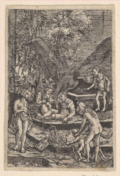 Curator: This is Giorgio Ghisi’s “Cupid and Psyche,” an engraving from 1573-1574, now at the Metropolitan Museum of Art. The print masterfully uses line to depict the mythological narrative with a distinctive Mannerist flair. Editor: My immediate impression is one of overwhelming detail. The entire surface teems with figures, textures, and minute gradations of tone achieved through incredibly fine hatching. There's a certain density to the image that’s both fascinating and slightly unsettling. Curator: Ghisi, trained in the Netherlands and Italy, achieved widespread recognition for his prints, especially those after the works of Giulio Romano and other leading artists. Prints such as these were critical for circulating artistic ideas across Europe at the time. “Cupid and Psyche,” with its sophisticated allegorical content, reveals a great deal about the social role art played during the Renaissance. Editor: It’s undeniable that the engraving presents a complex layering of scenes within the larger image. The primary focus is the reclining Cupid and Psyche, but behind them unfolds a secondary landscape filled with satyrs and nymphs, all rendered with remarkable precision using various linear techniques. The contrast in the composition emphasizes the love between Cupid and Psyche as an allegory for marriage. Curator: Indeed. These prints would have catered to erudite collectors, humanist scholars, and artists themselves. The layered imagery, the allusions to classical mythology, it all speaks to a learned audience engaged with complex symbolic meanings. It's not just about aesthetic enjoyment, it’s about intellectual engagement. We shouldn't overlook the implications related to gender in the depicted power dynamic between Cupid and Psyche. Editor: I agree; there's a definite emphasis on idealized forms, the contrapposto poses. The quality of the line work is what is most striking. The line becomes both descriptive and expressive in its modulation. Curator: Thinking about the artwork today, I'm struck by how prints like this provided a platform for artists to experiment with innovative forms and complex narratives, directly impacting public understanding of cultural norms of marriage in Renaissance society. Editor: From my side, focusing on the formal structure, it gives us a valuable lesson in how to balance detail with overall legibility through effective and inventive employment of techniques of the line and texture. Curator: A worthy insight. Looking closely at it now, I'm drawn again to considering the engraving's effect on society's understanding of mythology during the period. Editor: And I will admire it for its pure compositional integrity.