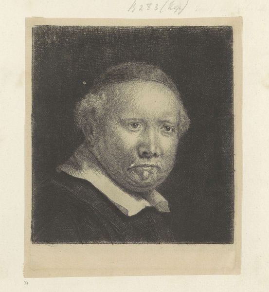 Editor: So, this etching by Rembrandt, dating back to 1658, is called "Lieven Willemsz van Coppenol: the Larger Plate." There's such incredible detail achieved with such a limited palette. I'm really struck by the subject's expression…a kind of quiet intensity. What stands out to you in this portrait? Curator: You know, what gets me every time with Rembrandt is his use of light, or the *absence* of it, really. He sculpts with shadows, doesn't he? Van Coppenol emerges from this velvety darkness, this palpable void. It feels less like observation and more like conjuring. And his gaze… doesn’t he seem to be holding back secrets? Or maybe just incredibly bored with the whole sitting? Editor: That tension between secrets and boredom is really interesting! So much personality from just lines on paper. Curator: Exactly! Rembrandt wasn't just depicting a likeness; he was exploring the inner landscape of a person. That blank space below the portrait… what do you make of that? He usually uses that space to write the subject’s name! Why leave it blank here? Editor: Maybe he wanted the viewer to fill it in themselves, to kind of collaborate in creating this person's identity? Or perhaps this work is meant to be perceived less as a declaration and more as a proposition to what identity might be? Curator: I love that! A collaborative portrait! Maybe the sitter, too, was uncertain of his identity, just starting the journey toward the answer. Think about it… Rembrandt gives us a prompt; he lets the shadows whisper, and then he lets us decide what they mean. Editor: It's amazing how a centuries-old print can still invite such personal interpretation. I’m going to see this work in such a different light now. Thank you! Curator: And thank *you*! Perspective is like a playful stream; it is meant to meander, reflect, and surprise. Until our next voyage of rediscovery, adieu!