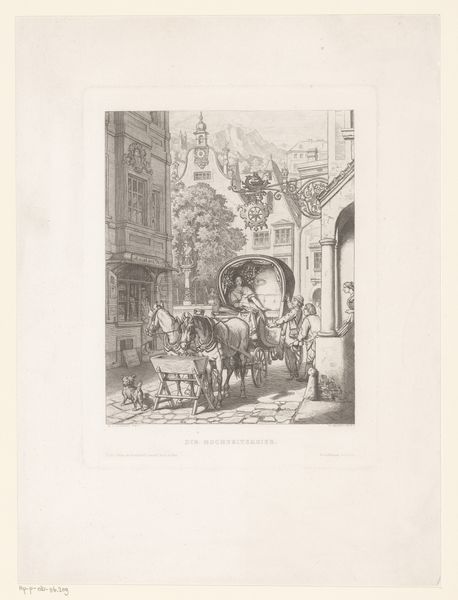 Curator: Instantly, it feels like a stage set, doesn’t it? All the hustle and bustle somehow frozen in a meticulously crafted moment. Editor: This print, entitled '"Tricycle'-omnibus rijdt over een plein,' roughly translated to "'Tricycle'-Omnibus Riding Across a Square," was created by Victor Adam around 1830. It's a fascinating window into a bustling city square rendered in engraving. Curator: Engraving... It’s funny, isn’t it? How such a precise technique captures something so chaotic. There's something theatrical in the light, directing my eye. I am seeing stories, really, micro-narratives bursting out of every corner! Editor: The "tricycle-omnibus" itself is quite symbolic. Representing the advent of public transport and the shifting dynamics of urban life. Note also the architectural forms. I wonder what visual language Victor Adam employed to describe city life? Curator: City life looks performative, in those years! Even that statue looming in the background – everyone's a player, watched over by civic memory and perhaps the weight of expectation. Editor: Precisely. Think of Romanticism as more than just landscapes; here, we see its application to the burgeoning urban environment. How people and places were interacting in entirely novel ways at the time. You get a distinct sense of spatial layering as people wander or crowd. Curator: The people interest me... Notice that there’s this feeling that no one sees each other, there’s an atomization implied, which must have been an utter novelty when populations exploded so rapidly at the time, huh? Editor: Indeed. Every element adds a dimension—the beggar, the fashionable lady in the omnibus, the riders... All pieces contributing to the larger portrait of early 19th-century city existence and its increasing segmentation, yet existing so closely together in urban proximity. Curator: Almost like a mosaic of humanity captured on a single, etched plate. I appreciate the perspective you offer on Adam’s symbolism and on its time and context, and to be sure there's so much here! The old among the new! It looks to me a bit more joyful now. Editor: Well, perhaps there is beauty in its observation, in the small theater of its time… Thanks for that perspective; it truly brings it to life for me.