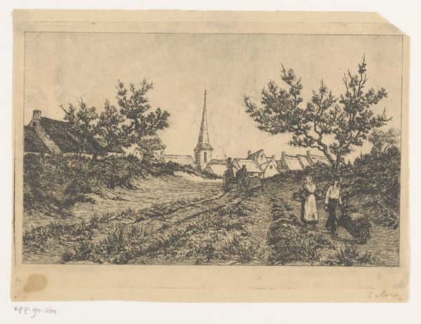 Frans Van Kuyck created this print, titled 'Village View with Country Road in the Kempen', using etching techniques. Van Kuyck's artistic career developed in the late 19th century, a period marked by significant socio-economic change in Europe, especially in rural communities like the Kempen region in Belgium. The image portrays a seemingly simple scene of rural life, yet it subtly reflects the realities of labor, class, and gender roles. We see figures, likely a working-class couple, who appear in the foreground alongside a path leading towards the village. Their inclusion invites us to consider the physical and emotional labor that defined the lives of people in these communities. The woman carrying a basket, while the man pulls a cart, suggests a division of labor that was typical of the time. Through its composition, the artwork shapes our understanding and invites an emotional connection to the lives and histories of its subjects.