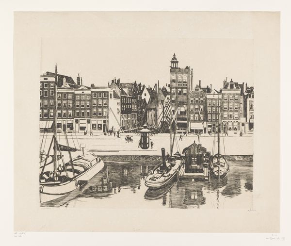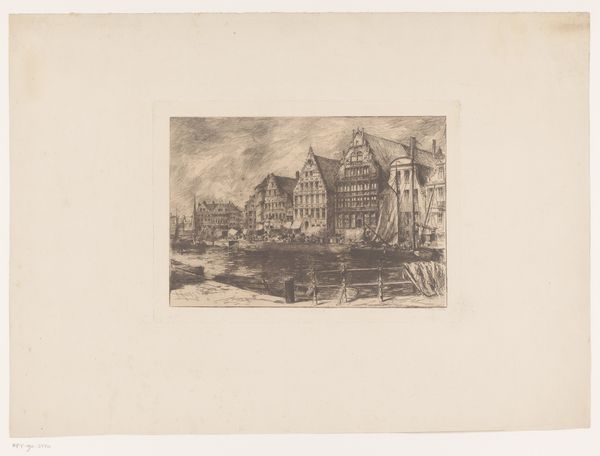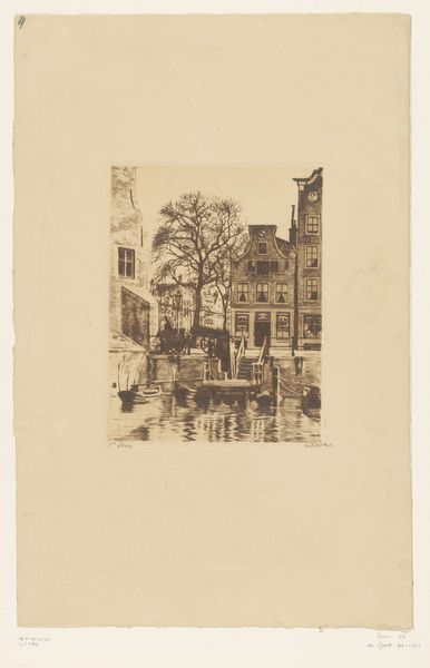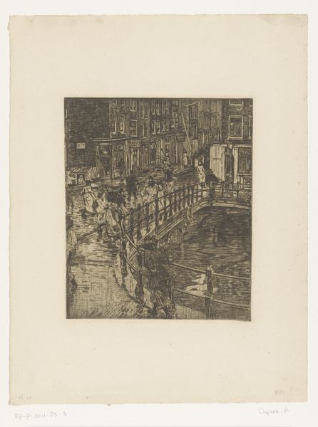 Willem Witsen created this etching, titled 'Gezicht vanaf het Rokin naar het noorden', with a needle and mordant on paper. The scene shows a view from the Rokin in Amsterdam, likely made in the late 19th or early 20th century. Witsen belonged to a group of Dutch artists known as the Amsterdam Impressionists. They were reacting against the formal art academies and sought to capture everyday life in the city. Here, the artist is concerned less with historical grandeur and more with the quiet pulse of modern life. The buildings, bridge, canal boats, and figures all blend harmoniously. As a historian, one can delve deeper into the urban planning and social changes occurring in Amsterdam at the time. Resources such as period maps, photographs, and municipal archives could shed light on the specific transformations Witsen was observing and how they reflect broader shifts in Dutch society. Only by understanding this social and institutional context can we truly appreciate the work.