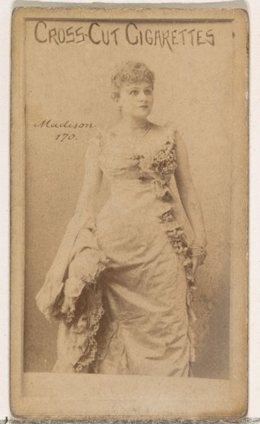 Editor: Here we have "Selina Delaro, from the Actresses and Celebrities series," created around 1887 for Allen & Ginter. It appears to be a print, a sort of sepia-toned portrait. What I find striking is how this image of what looks like a high-society woman was used to promote, of all things, cigarettes! How do you interpret this work? Curator: The immediate hook, isn't it, is the seemingly incongruous pairing. Images, you see, were not just representational but powerful tools of persuasion. By associating their tobacco with actresses, Allen & Ginter were subtly imbuing their brand with the allure and sophistication these women represented. Note how the "Little Beauties" moniker creates a perceived link between the actress and the cigarette brand. The image becomes a carefully crafted symbol, appealing to the desires and aspirations of the consumer. What cultural memory does this summon for you? Editor: It's interesting you call it "symbolic." It makes me think of advertising today and how we still associate celebrities with products to make them more appealing. Curator: Precisely! The cultural thread continues. And that "high-society woman" wasn't just a pretty face; she was a cultural touchstone. She signified success, beauty, and a certain je ne sais quoi that brands wanted to borrow. Do you think Selina Delaro herself had a say in how her image was being used? Editor: Probably not much say, I imagine. Women’s images have been used this way for a very long time. Curator: A sobering thought. Understanding the layers of meaning behind an image helps us understand cultural history and the messages it conveys. This piece is much more than a pretty picture, wouldn't you say? Editor: Definitely. It really highlights how images carry so much more cultural and psychological weight than we might initially think. Thanks for helping me see all the symbolism embedded in this piece!