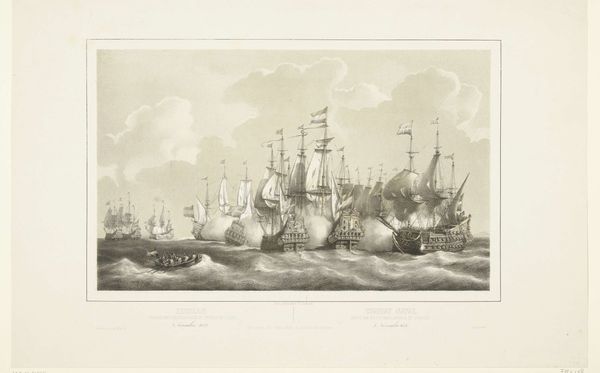 Curator: Welcome. Today, we’re looking at “Zeeslag bij Doggersbank, 1781,” an engraving by Daniel Lerpinière from 1782. What are your initial thoughts? Editor: Immediately, the drama of this piece strikes me. It's chaotic yet ordered, dominated by an oppressive sky and bristling warships engaged in intense combat. There's a powerful tension, almost operatic. Curator: Lerpinière’s skillful use of line certainly creates that drama. Note how the density and direction of the engraved lines give shape to the forms, define texture in the waves and clouds, and generate such a vivid sense of depth, structuring the composition with its meticulous detail. The print method in itself flattens reality to black-and-white lines, making us examine form more than anything else. Editor: Absolutely. Considering this depicts the Battle of Dogger Bank during the Fourth Anglo-Dutch War, one must also contemplate whose perspective we are viewing. The ships of the British Royal Navy are prominently in the foreground, engaged in battle against a smaller squadron of ships representing the Dutch Republic. Curator: Indeed, these compositional elements draw us to the forms of the vessels: The ships are rendered with incredible precision. He emphasizes the sails, the rigging—all of it constructed with lines forming intricate shapes. Editor: But at what cost? Beyond a feat of artistic skill, shouldn’t we reflect upon the romanticizing of violence and imperial ambition? War is being portrayed here in an appealing, almost aesthetic way. The human suffering, the real cost of the naval conflict is rendered invisible, reduced to the glory of British maritime supremacy. Curator: It is vital to be historically sensitive, yet by closely inspecting the work’s intrinsic visual language, we understand how effectively it communicates a certain point of view. The engraving, a reproductive medium by design, disseminated such narratives. It served to glorify the nation. Editor: A chilling reminder of how art can normalize and validate political and military power. I’m also considering how these images perpetuated imperial dominance as visual propaganda during its time and to ours. Curator: Thank you, your view definitely challenges mine. The lines and shapes work harmoniously but there is tension between the subject of empire it depicts and the means of printmaking that democratized such depictions. It definitely gave me much to ponder about hierarchies and accessibility.