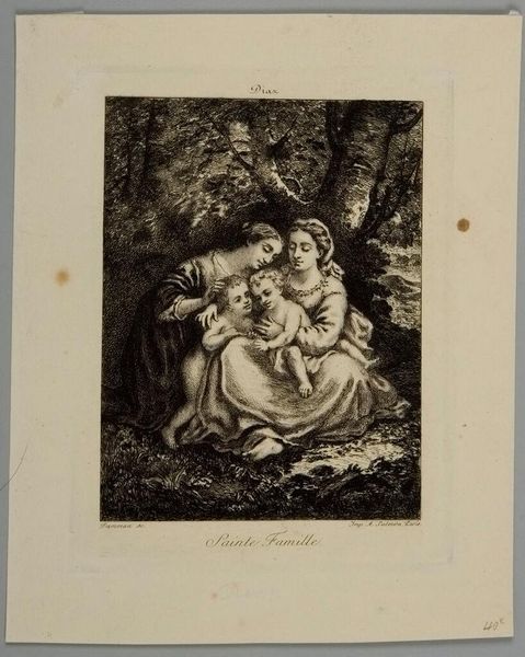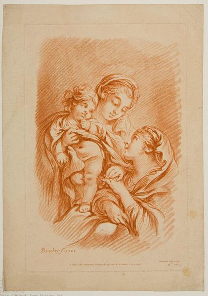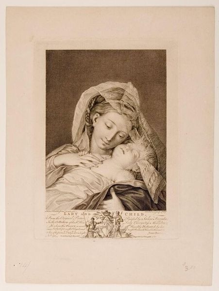 Curator: Johann Georg Wille, born in 1715, created this image, "Motherly Delights". It’s currently housed at the Harvard Art Museums. What do you see? Editor: A tender bubble. The oval frames a moment of profound connection. I feel the soft weight of the child, the mother's gentle strength. It’s intimate. Curator: Yes, the print captures the ideals of motherhood that were emerging in the 18th century. Motherhood became recognized as a vital role in society, a political idea. Editor: And yet, stripping away the politics, there's something timeless. Every mother holding her child, isn't it? A story told over and over, across centuries. Curator: Absolutely. The image’s circulation contributed to shaping those perceptions, though. The print itself had a public role. Editor: Art mirroring and shaping life. I felt the warmth of it immediately. That’s its magic, isn’t it? Curator: It certainly has layers. Thank you for sharing your perceptions. Editor: My pleasure, as always. What a thought-provoking piece.