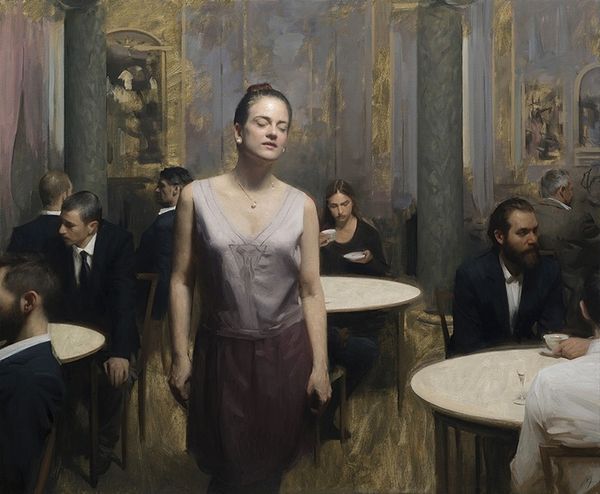 George Luks created this oil on canvas painting, now in a private collection, with loose brushstrokes, particularly visible in the background and the figures' clothing. The composition is structured around a contrast between light and shadow, drawing the viewer's eye to the young woman at the center. Luks masterfully uses color to delineate space and mood. The muted palette, punctuated by the woman’s coral dress, creates a sense of urban melancholy. Her downcast gaze and the surrounding somber figures evoke a feeling of alienation. This painting operates on a semiotic level. The café setting, the figures’ attire, and their interactions, or lack thereof, signify a modern, urban experience marked by detachment. The checkered tablecloth, a geometric grid, could symbolize the structured, yet often impersonal, nature of modern life. Luks’ emphasis on capturing transient moments reflects a broader artistic concern with depicting the complexities of modernity. This work challenges traditional portraiture by focusing less on individual identity and more on the subject's place within a social and cultural context.
