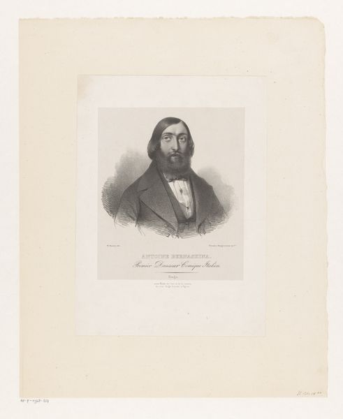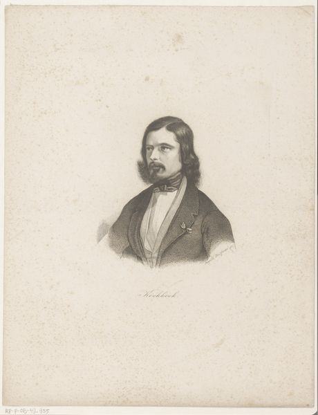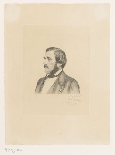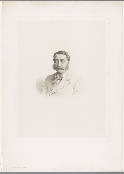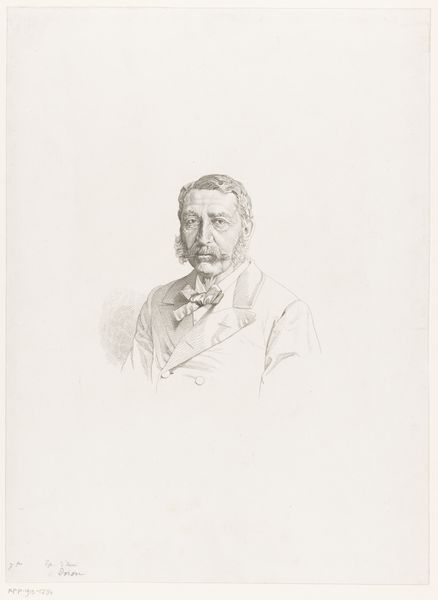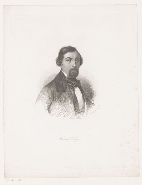 Editor: This is “Portret van Salomon Hermann von Mosenthal,” created after 1845 by Georg Wolf. It looks like a print, maybe an engraving. It’s incredibly detailed, but also feels very formal. What strikes you about this portrait? Curator: Formally, I'm drawn to the contrasting textures achieved through the engraving technique. Observe how the artist differentiates the soft fabric of the suit from the intricate detail in the face, especially around the eyes and mouth. Editor: Yes, the detail is amazing. What about the light? Curator: Precisely! Notice the way light falls across the subject's face. The artist uses subtle gradations in tone to create a sense of volume and depth. Consider the semiotic weight of the sharp contrast between the dark coat and white shirt, drawing attention to the face as the locus of intellectual prowess. This is reinforced through linear structuring: the strong horizontals of the shoulders, broken up and destabilised by the diagonals in the folds and shadows. Editor: I never thought of it that way, that is, of contrasting structural arrangements. It's so subtle. How does the scale factor into your analysis? Curator: The size allows for intimate viewing; yet this intimacy is undercut by the sitter’s direct gaze. This opposition creates tension. The portrait invites, then subtly rejects the viewer, maintaining distance, in a calculated dynamic, perhaps, one of class. Is such an effect still relevant today, do you think? Editor: Possibly. I hadn't considered how those choices contributed to the overall effect. Thank you! Curator: The pleasure's been mine. It is ever-fascinating to unravel how form mediates meaning.