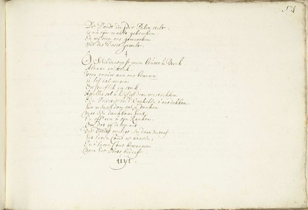 Curator: This drawing, titled "Triomflied over de Schilderkunst en de Dood (deel 1)", or "Triumphal Song About Painting and Death (part 1)," created around 1660 by Henrik Jordis, offers a fascinating insight into the artistic discourse of the Dutch Golden Age. It's ink on paper, with clear signs of age in the fading of the text. Editor: It’s delicate. The script, while faded, still flows gracefully across the page. The entire piece breathes transience, doesn't it? A quiet meditation on mortality and art. Curator: Indeed. Jordis was clearly concerned with the act of creation and its relationship to time, labor, and even oblivion. Consider how the fading ink physically embodies the decay it describes. The materiality of the artwork directly mirrors its theme. And we should also take a look at the paper itself, perhaps the sheet comes from a family owned mill, with strong ties to bookbinders of the time. Editor: And structurally, notice the balance. The lines of text create a visual rhythm, drawing the eye across the composition, even without strong contrasts in color or value. The negative space becomes almost as important as the written word. The poem appears to build incrementally from upper-left to the lower-right, with short pauses and shifts on both halfs. It brings forth a great unity. Curator: That harmony definitely reflects broader cultural currents, especially when discussing the vanity and inevitable passing of art. We should consider, too, how this particular example functions as part of a larger network. Where exactly did this drawing originate, for example? And how many artists would've seen this page, handled it, discussed its ideas? The consumption and circulation are just as crucial as its formal qualities. Editor: True. Yet the impact still rests upon Jordis’ artistic decisions, his choice of script, layout, even the pressure he applied to the pen. By focusing on the surface, we glean so much about the underlying sentiment and skill that constructed this visual argument. Curator: Well, I think both our angles show how rewarding engaging with this piece is. By considering the creation, material history, and even modes of artistic composition of works such as Jordis', we deepen our comprehension of artistic ingenuity itself. Editor: Agreed. "Triomflied" is beautiful evidence of how even the smallest, most fleeting gesture can contain multitudes.
