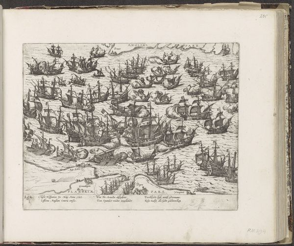 Curator: This is an engraving titled "Aankomst van de zes schepen bij St. Vincent, 1615," or, in English, "Arrival of the Six Ships at St. Vincent, 1615." It’s attributed to an anonymous artist, and although the event occurred in 1615, the work was likely created sometime between 1617 and 1646. Editor: My first impression is…controlled chaos. A delicate, scratchy, beautiful rendering of something not so beautiful, really. So much detail crammed in. I'm drawn in by this dance of industry and the tiny fires. Curator: Yes, "controlled chaos" is fitting. The work exemplifies Dutch Golden Age sensibilities; the artist is carefully documenting a specific historical event. These engravings served a crucial public function. They broadcast information about the Dutch Republic’s global activities, visually articulating power and trade. Editor: Art as propaganda, you mean? Perhaps, but looking at this image is like peering into someone else’s very specific dream, even if they intend for you to buy into their view of things. Curator: Well, considering the context of this image, there are competing claims about that "dream." Here we see not just the arrival, but what appears to be some conquest and subjugation, depicted from a specific Dutch perspective. We must remember how visual documents like these bolstered narratives that justified colonial expansion. The events that it showcases tell an interesting story, don't you think? Editor: Indeed. So much information is rendered, all that beautiful engraving. There are people moving around everywhere. The details, although, can be really easy to overlook given the sheer size of the harbor that the six ships landed on. It is interesting how some shapes tend to have little significance and purpose for viewers when placed next to some elements like people that do! Curator: And, look closely: on the right, some structures seem to be in flames; the figures are presented formally in ways that suggest organized governance. Editor: Right, I am so focused on those lines that all create this intricate pattern. The light and shadow, implied in the engraving, really sets a serious tone, regardless of who and why that arrival happened in St. Vincent. Curator: These engravings helped construct and circulate specific cultural and political understandings about overseas territories and power. Thanks for letting me consider this from another angle. Editor: Anytime. Looking at it has made me re-think how narratives and emotions were being translated way back then and now!