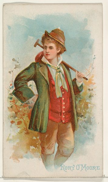 Editor: This is "Irish, from World's Dudes series (N31) for Allen & Ginter Cigarettes," dating back to 1888. It seems to be a drawing or print, and the materials listed include colored pencil and etching. It's a somewhat strange little piece. What strikes you about it? Curator: Immediately, I'm drawn to the context of its creation: as a cigarette card. Think of the labor involved. The etching process, the colored pencil application, then mass production for commercial purposes. It collapses the high/low art divide by being both an "original" artwork and a commodity object circulating within a consumerist society. Editor: So, you're saying its value isn’t just aesthetic, but resides in the process and how it was used? Curator: Precisely! The image itself exoticizes an Irish archetype for the consumption of American cigarette smokers. Notice the title: “Irish.” Not a person, but a type. What materials contributed to constructing and perpetuating this idea? The paper, the ink, the printing press… these all played a role. Editor: It makes you wonder about the unseen workers involved in production, and how their labor relates to this idealized image of Irish identity. Curator: Absolutely. It’s crucial to examine art not just as a visual object, but as a product of material processes and social forces. How were the raw materials sourced, processed, and assembled? The ‘World’s Dudes’ title also begs exploration: Who is considered worthy of representation and how does it reflect on power dynamics related to labor? Editor: That gives me a lot to think about, moving beyond just the surface level of the artwork to understand its production and consumption. Curator: Yes, seeing art as connected to broader systems of labor and capital changes our understanding.