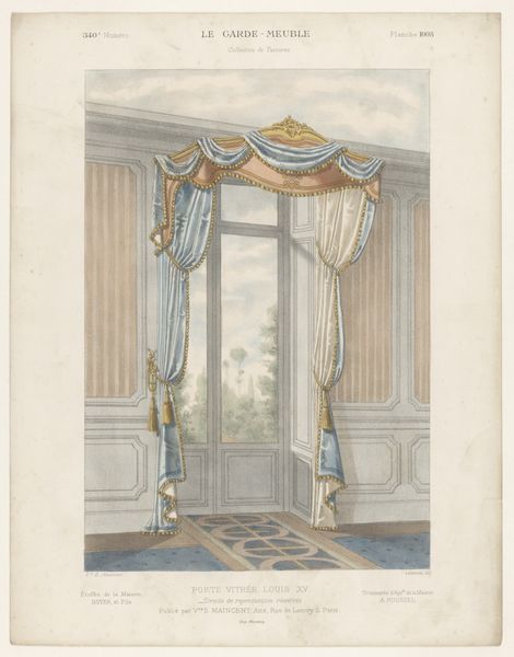 Curator: Let's examine this fascinating print, “Haard met draperieën,” or “Fireplace with Draperies,” created circa 1885-1895 by Léon Laroche. It showcases a meticulously designed fireplace ensemble. What’s your immediate impression? Editor: An overwhelming sense of opulence, yet strangely sterile. The rendering is so precise; I'm struck by the careful balance of the composition, particularly how the central clock anchors the swirling fabric. The subdued watercolor palette also evokes an air of aristocratic reserve, not exactly the inviting warmth one would expect from a hearth. Curator: Interesting, I see it somewhat differently. Keep in mind that this print belongs to a broader movement toward the democratization of design. "Le Garde-Meuble", which is printed across the top of this page, was a catalogue of reproducible designs and models available to be commissioned and put into production. While the design reflects Rococo flamboyance, its accessibility through print culture challenges traditional notions of bespoke art for the elite. Editor: True, but notice how the artist uses watercolor to achieve that smooth, almost photographic rendering of the drapery? There's a tension between the desire to democratize style through mass production and the reliance on formal refinement. Curator: It’s certainly a balancing act! Consider how the prints offered aspirational interiors, but in a form easily disseminated among a wider public. They effectively reshaped public perceptions of domestic style and elevated interior design's role. Editor: The visual trickery really stands out, doesn't it? Look how the mantle mirrors the contours of the drapery. It's almost a theatre set, rather than a functional fireplace, highlighting aesthetics above all else. Curator: Precisely. This print doesn't just depict an object; it markets an idea – that good taste and design are not exclusively the domain of the upper classes, though certainly still inspired by their luxurious trappings. Editor: So, the aesthetic object performs a crucial socio-political function. A subtle transformation through the medium of print. Curator: Exactly. This decorative artwork, in many ways, embodies an era undergoing significant social changes, expressed through the language of domestic interiors. Editor: It’s compelling how an ostensibly simple print speaks volumes about access, aspiration, and the evolving landscape of taste during that era.