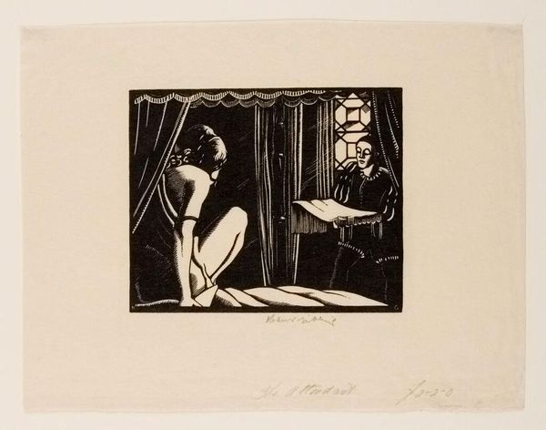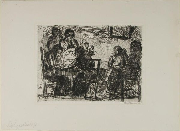 Curator: Immediately, I feel the weight of solitude in this piece. Editor: Indeed. This is Ernst Barlach's "The Harpist," currently residing at the Harvard Art Museums. The stark charcoal seems to amplify the isolation, doesn't it? Curator: Absolutely. The harpist's long hair and beard, almost blending into the shadows, evoke figures of hermits or prophets, individuals set apart. Note the window's cross shape, perhaps hinting at spiritual solace. Editor: It’s funny, I see the cross more like bars. The harpist's music, maybe his only escape? It feels like he's imprisoned by his own melancholy. Curator: Or perhaps he's finding freedom in the music. Music as a transformative power, transmuting suffering into art. It's a powerful archetype. Editor: Hmm, I still feel the sadness, but I can appreciate the archetypal reading now, seeing it as the artist creating art out of the darker sides of life. Curator: A potent reminder of how symbols evolve and transform through our own experiences. Editor: Exactly. Art unlocks that potential in us.