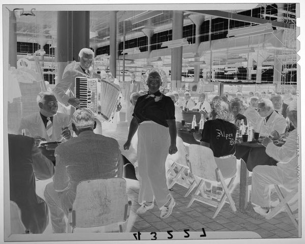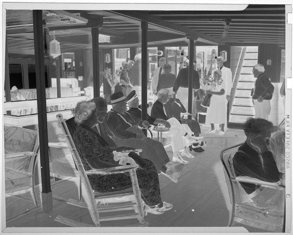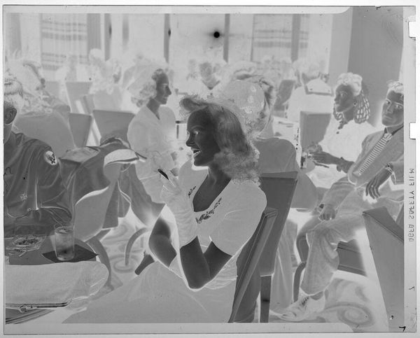 Editor: This is an untitled photograph by Martin Schweig, showing people at a party. The inverted tones give it a spectral quality. What do you see in this piece, focusing on its formal elements? Curator: The most striking aspect is the contrast. The stark juxtaposition of light and shadow flattens the scene, emphasizing the geometry of the tables, chairs, and figures, reducing them to abstract shapes. Note how the composition directs the eye through a series of planes, a sophisticated use of pictorial space. Editor: So you're saying the formal arrangement overrides any narrative? Curator: Precisely. The artist seems less concerned with capturing a specific event than with exploring the visual relationships between form and light, creating a study in contrasts and textures. Editor: It is a unique perspective. I’ve never thought about photography this way before. Curator: Focusing on these elements really opens up a new way of looking, doesn't it?