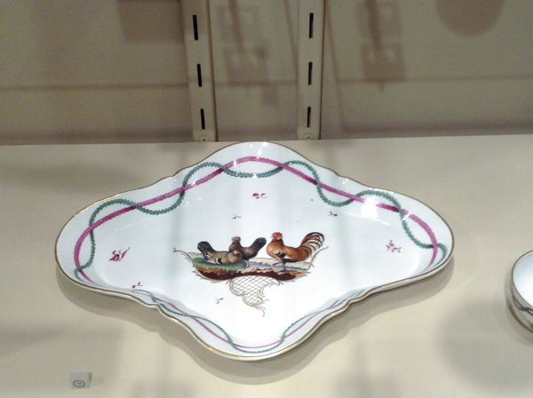 Editor: This is an Oblong Spoon Tray, crafted between 1765 and 1770 by the Worcester Porcelain Works. It’s ceramic and porcelain, and currently held at the Minneapolis Institute of Art. The intricate designs, particularly the avian and insect motifs against that rich blue, give it such a delicate feel. How do you see the elements of design working in this piece? Curator: Notice first how the undulating edge plays with the flatness of the base, creating a delightful tension. Then consider the symmetry, not quite perfect, yet fundamentally balanced, directing your eye across the surface. The central medallion of insects creates a focal point from which the avian quadrants radiate. How does this orchestration of space and form strike you? Editor: I see the balance, certainly, and I agree the gold accents enhance the symmetry, creating a sophisticated, formal appearance, while also contrasting that gorgeous dark blue. Curator: Precisely. Now consider the choice of decoration: abstracted forms, idealized portrayals of nature. What might that suggest about its function as a ‘spoon tray’? It’s clearly not just utilitarian. Editor: So, its visual complexity elevates it beyond a simple function? Almost rendering the utility secondary to the aesthetic experience? The vibrant imagery almost overwhelms the practicality, it is so lovely. Curator: A keen observation. The balance of form and function—or rather, the potential dominance of form—places it within a very specific discourse of 18th-century aesthetics and craft. Its construction elevates and refines porcelain work into fine art. What aspects have changed your viewpoint regarding this artifact? Editor: Recognizing the significance of composition and symmetry, and appreciating its departure from pure functionality, that’s broadened my appreciation significantly. Thanks so much! Curator: It was my pleasure to explore this piece alongside you.