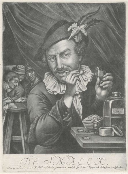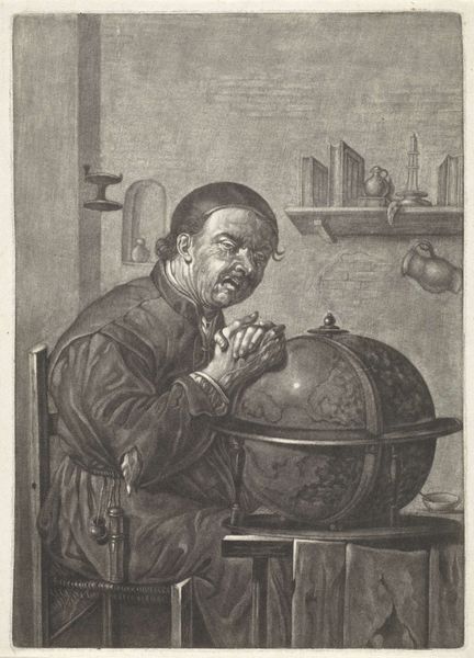 Editor: Here we have Jan van der Bruggen's engraving, "Democritus lacht," dating between 1659 and 1726. The laughing philosopher is really captivating! I am wondering about his relationship with knowledge since he is smiling wryly at a globe... How would you interpret this piece in light of Dutch Golden Age societal values? Curator: That's a keen observation! Looking at "Democritus lacht" within its socio-political context, it prompts several thoughts. Consider the Dutch Golden Age – a period of immense mercantile success and scientific discovery, yet also fraught with social stratification and moral debates. What role does laughter play in such a society when looking at intellectual achievement? Editor: Well, it's almost mocking, isn't it? Is Van der Bruggen perhaps poking fun at those obsessed with accumulating geographical knowledge, or maybe commenting on the futility of earthly pursuits amidst the backdrop of religious doctrine and societal expectations? Curator: Precisely! The figure of Democritus, a pre-Socratic philosopher known for his atomic theory and cheerful disposition, serves as a commentary on societal norms. Is Van der Bruggen highlighting the tension between empirical inquiry and philosophical skepticism? Consider who the image was intended for. Editor: Maybe wealthy merchants with burgeoning collections, proud to have knowledge and a globe to prove it! They get to laugh at themselves while looking intellectual and philosophical. Curator: Yes, a form of controlled critique and conspicuous consumption. And note how this image, multiplied through engraving, becomes accessible. This engraving circulated this sentiment throughout the Dutch Republic. Editor: So, this "laughing philosopher" becomes a sort of cultural artifact. This conversation has given me a different way to approach not just this work, but portraiture generally. Thanks! Curator: Indeed, seeing art as enmeshed in networks of power, knowledge, and access is essential. It was a pleasure!
