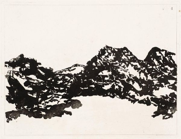 Curator: Looking at Alexander Cozens' "Plate 2," a landscape etching, the immediate impression is stark, almost brutal. Editor: It's a powerful study in contrasts, isn't it? The black ink aggressively shapes the landscape, creating a kind of sublime terror. Consider the historical context; Cozens was working at a time of significant social upheaval, and this landscape seems to mirror that turbulence. Curator: The composition, though, seems almost classically balanced. The peaks echo each other, framing the negative space. It's a study in line and form, isn't it? Editor: But that balance is deceptive. Look at the darkness dominating the scene, suggestive of the anxieties of an era grappling with industrialization and its impact on the natural world. Curator: A compelling point. Perhaps Cozens is not merely depicting a landscape but commenting on the societal forces reshaping it. Editor: Indeed. This piece encourages us to view art as a reflection of broader social and political narratives, rather than simply aesthetic beauty. Curator: It seems we both found something profound in what at first seemed like a simple landscape. Editor: Agreed, a testament to art's enduring power.