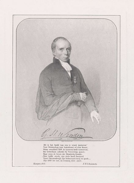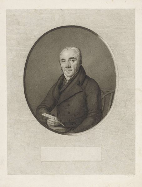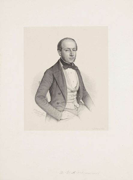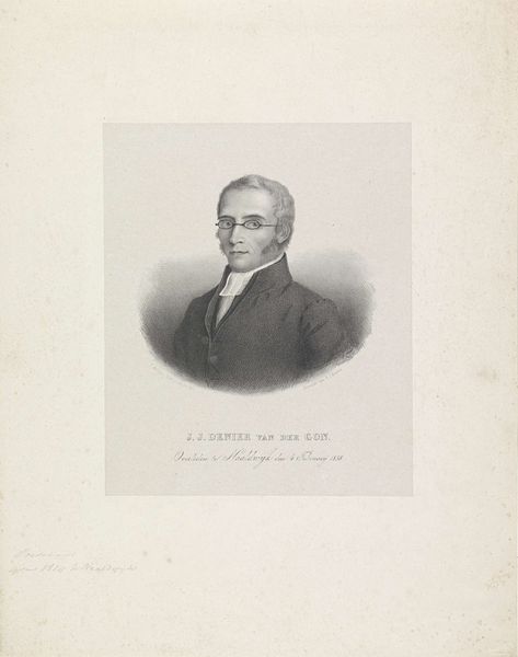 Editor: This is "Portrait of Christiaan Leonard van den Broek," likely from 1849, by Johann Peter Berghaus. It's a graphite drawing. He looks… stern, almost judgmental, peering through his glasses. What do you make of it? Curator: Indeed. Beyond a mere likeness, portraits often function as carefully constructed symbols of status and intellect. Note the man's clothing. Doesn’t the high collar and dark jacket suggest a certain austerity, a leaning toward intellectualism rather than extravagance? It’s interesting to consider how clothing itself functioned as a visual signifier of one's place within society. What emotions might that evoke in viewers today? Editor: That makes sense. It feels very proper and maybe a little distant. How does that tie into the symbolism you mentioned? Curator: Consider also the gaze. Does it meet yours directly, or does it seem to observe, assess? The glasses, too, are a key detail. The association of spectacles with scholarship was already well established by the mid-19th century. What continuities can you see between this carefully crafted image and portraits that you might see today? Editor: Hmm… I guess the attempt to project a certain image hasn't really changed. People still use clothing and posture to convey authority. I hadn't really thought about how deliberate all these details could be. Curator: Visual symbols are always doing cultural work, even when they appear commonplace or perfectly natural. So next time, look beyond the surface, and question what deeper cultural values they reveal to us. Editor: Thanks, that was really insightful. It’s given me a lot to think about regarding not just this drawing but all portraits.