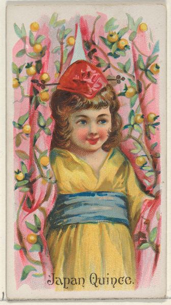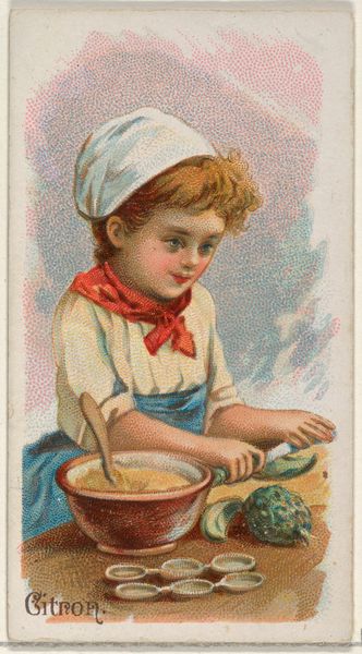 Curator: Here we have an interesting piece from 1886, titled "From the Girls and Children series (N64) promoting Virginia Brights Cigarettes for Allen & Ginter brand tobacco products," currently held in the Metropolitan Museum of Art. Editor: Well, immediately, I'm struck by its unsettling innocence. The vibrant colours, the delicate rendering of the girl, contrasts so sharply with the overt commercial purpose emblazoned at the top. There’s a tension there that grabs you. Curator: Exactly! These trade cards were designed to be collected, part of a wider phenomenon of using childhood imagery to soften the edges of tobacco consumption. The "Virginia Brights" brand clearly aims to associate itself with purity and domesticity. Editor: It's clever, in a disturbing way. The soft, almost pastel-like application of what seems like watercolor or maybe oil pastel lends an air of quaintness to the scene. Her blue dress and little hat, the patterned stool, all add to a very studied naiveté. It is meant to create a safe feeling and distract us from a hard-sell advertising of harmful items. Curator: The composition further emphasizes this calculated innocence. The girl is positioned centrally, framed by domestic items, but it's all a very deliberate construct. Note how her attention is entirely focused on her chore. Editor: I see the foreground. How she's positioned relative to the tub, the pitcher nearby— they all construct a clear, legible narrative, emphasizing labour and subservience from an early age. What do we make of the stool with twisted bars in the centre, or of that odd pitcher off to the side? Are these more overt markers to a privileged lifestyle for some, while for others, a mere promise or prospect to be had? Curator: Indeed. Allen & Ginter's marketing often played on these societal aspirations and presented a romanticised, idealized version of domestic life—especially where commodities and capitalist exploits were concerned, conveniently overlooking social realities. This is to create the allure of American Dreams that can be achieved with hard work. Editor: A curious insight for sure. It's fascinating how the interplay of colour and design reinforces a complex message. You can almost feel the societal pressures baked into the pigment itself. Curator: Precisely. It's a small image but speaks volumes about the values being promoted during the late 19th century. It reminds us to look deeper into not only art history, but society itself. Editor: And, for me, a testament to how formal analysis, when thoughtfully applied, can unearth uncomfortable truths hidden within seemingly innocuous aesthetics.
